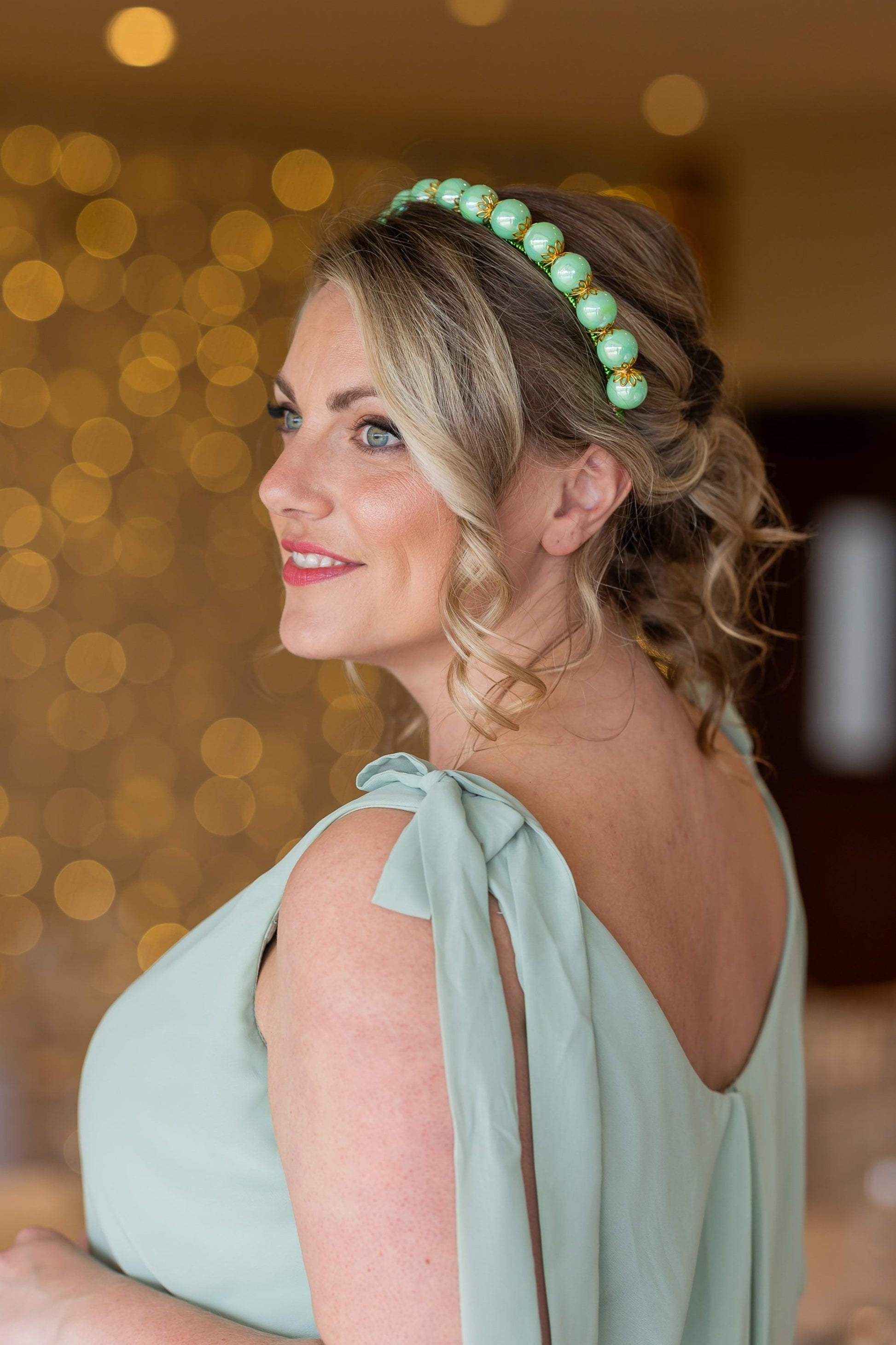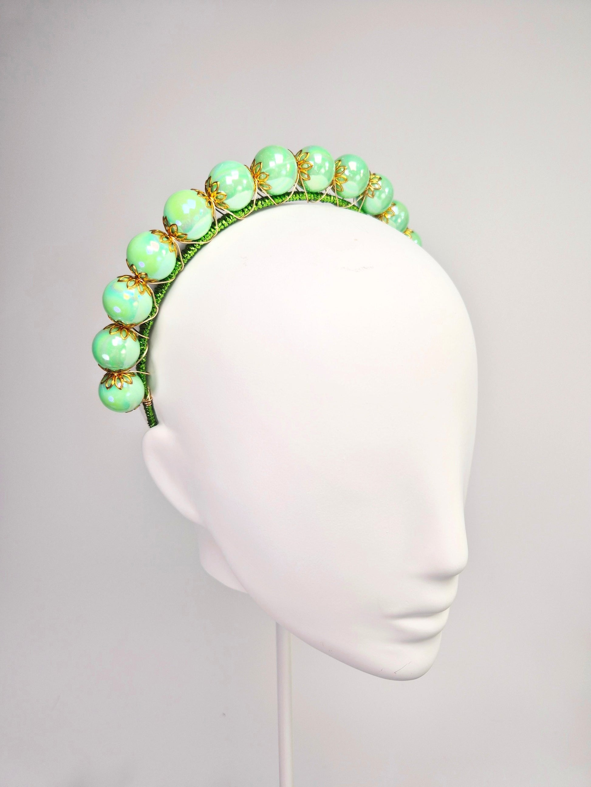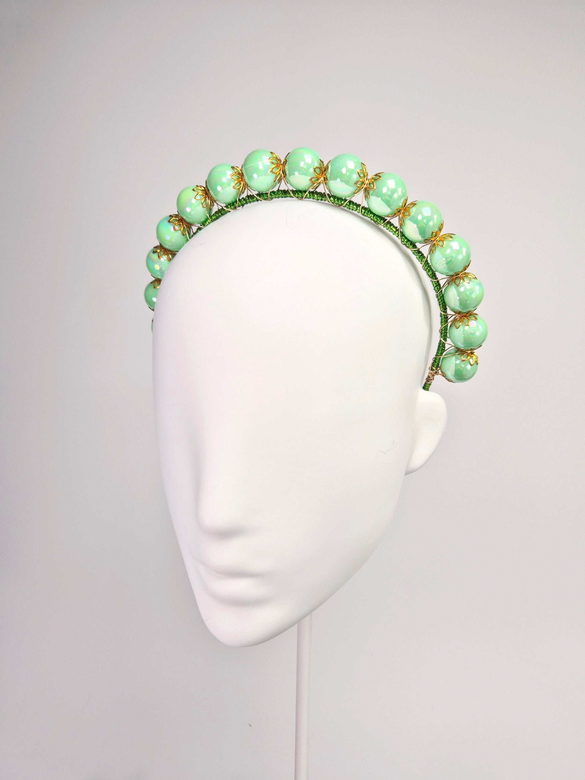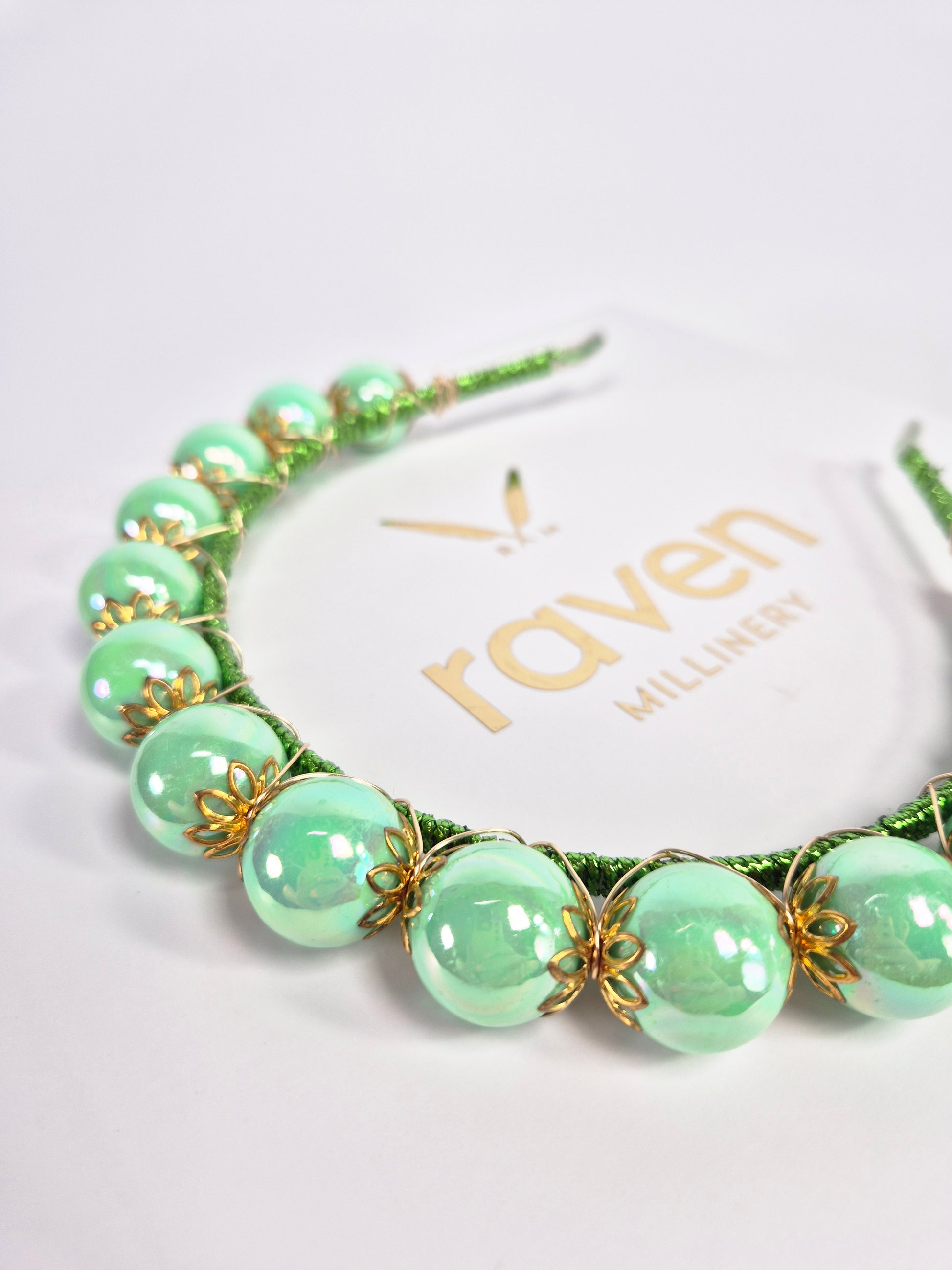 The Aura headband features mint pearl with a glossy finish that reflects light and gold trinkets for some added charm. It's the perfect accessory for a standout look.