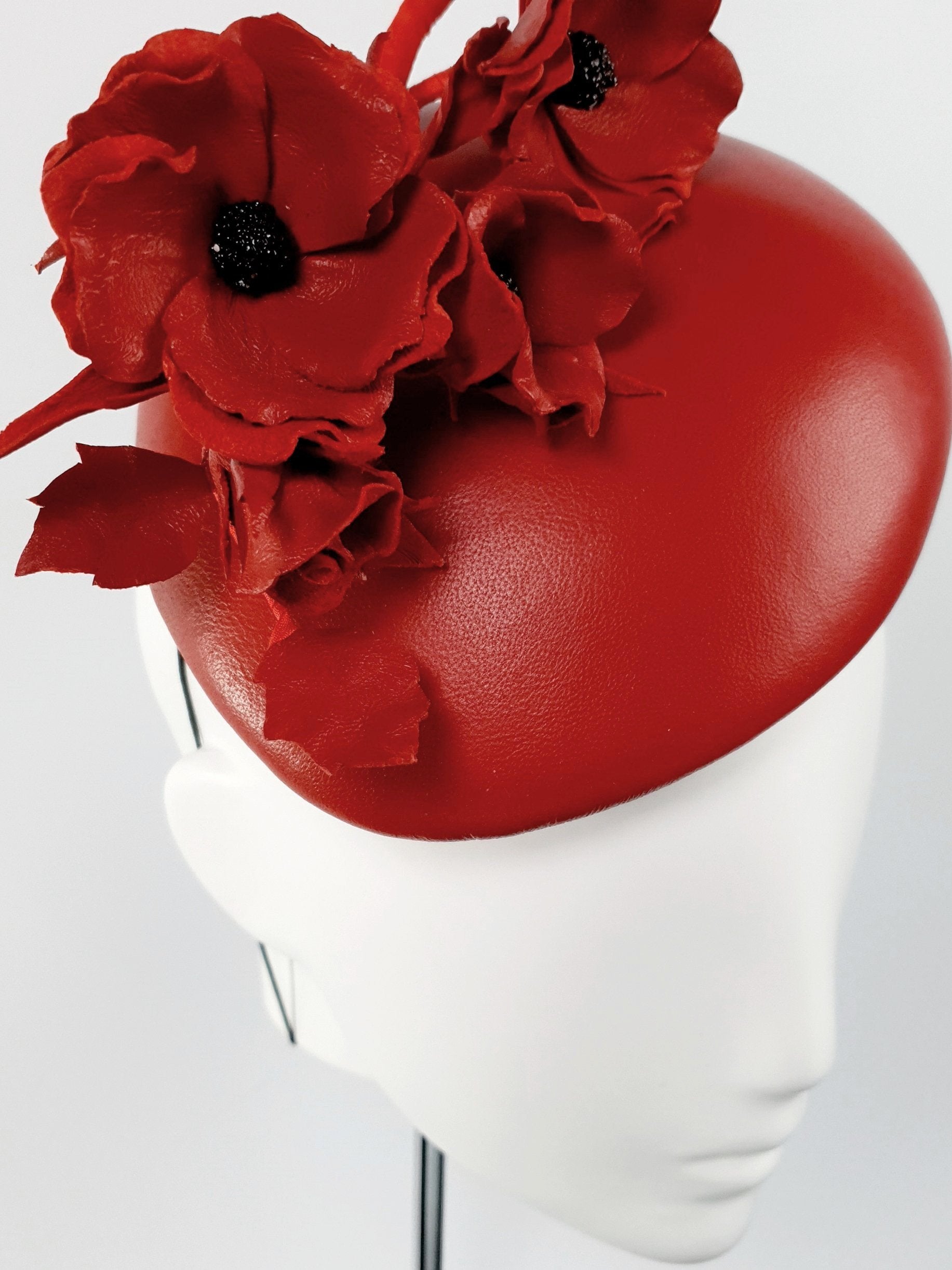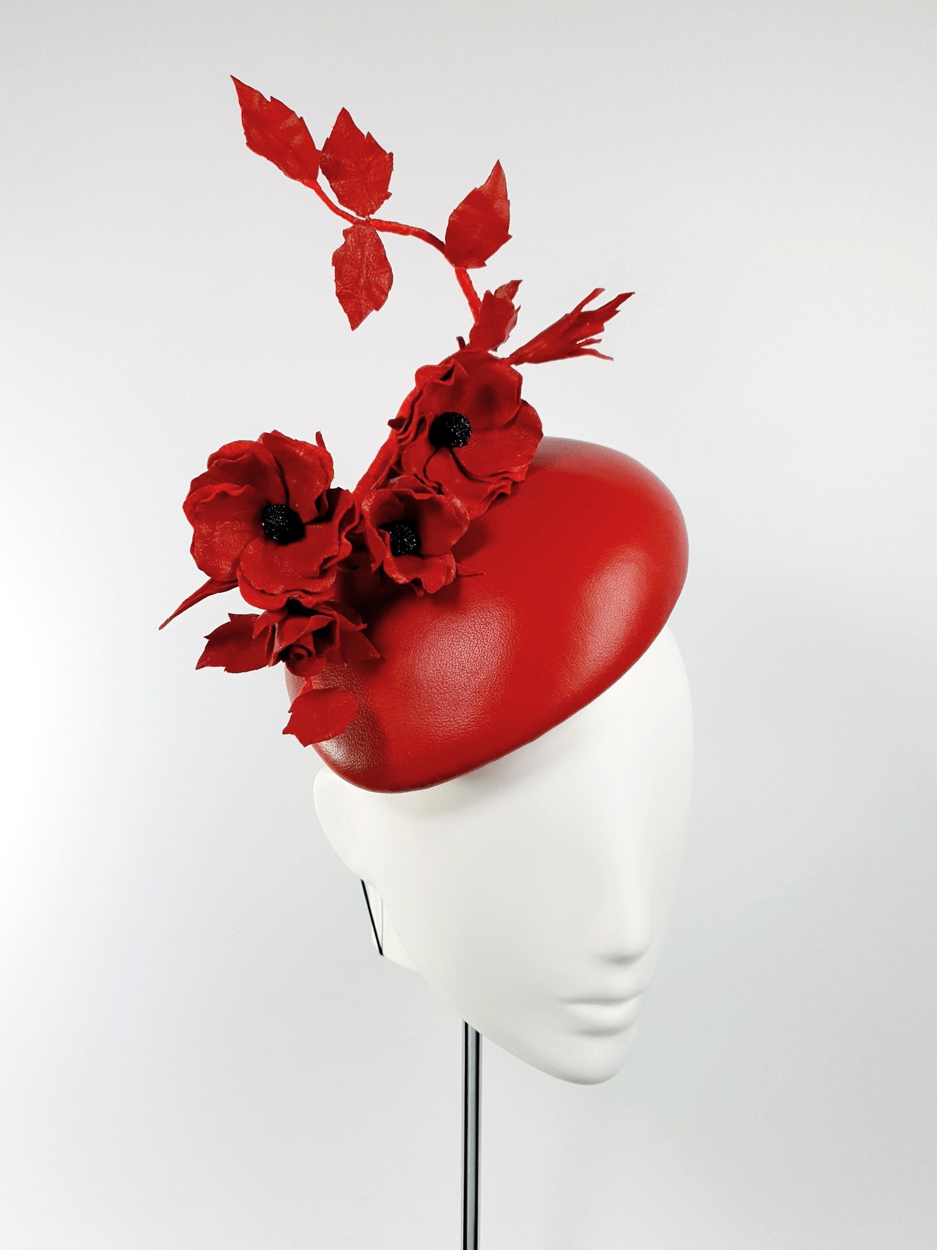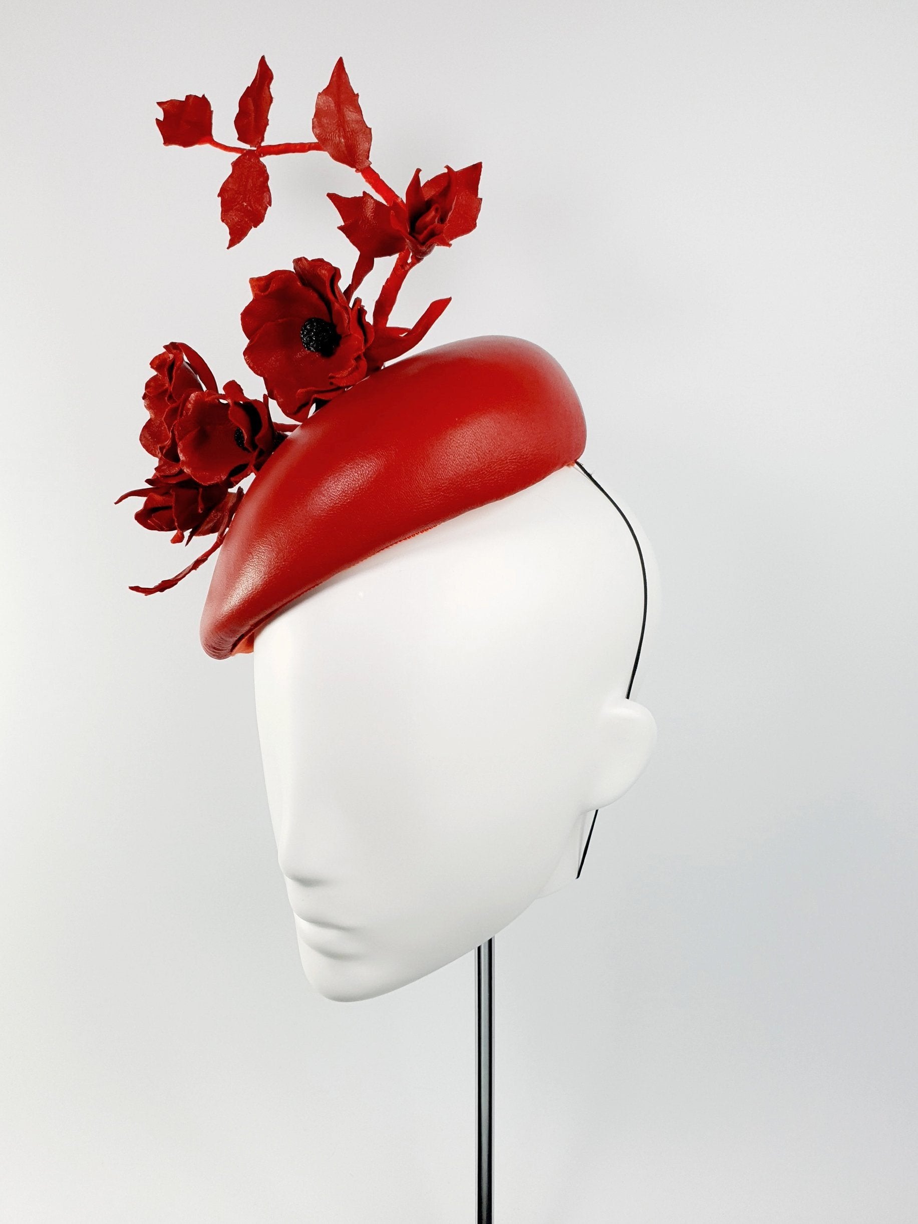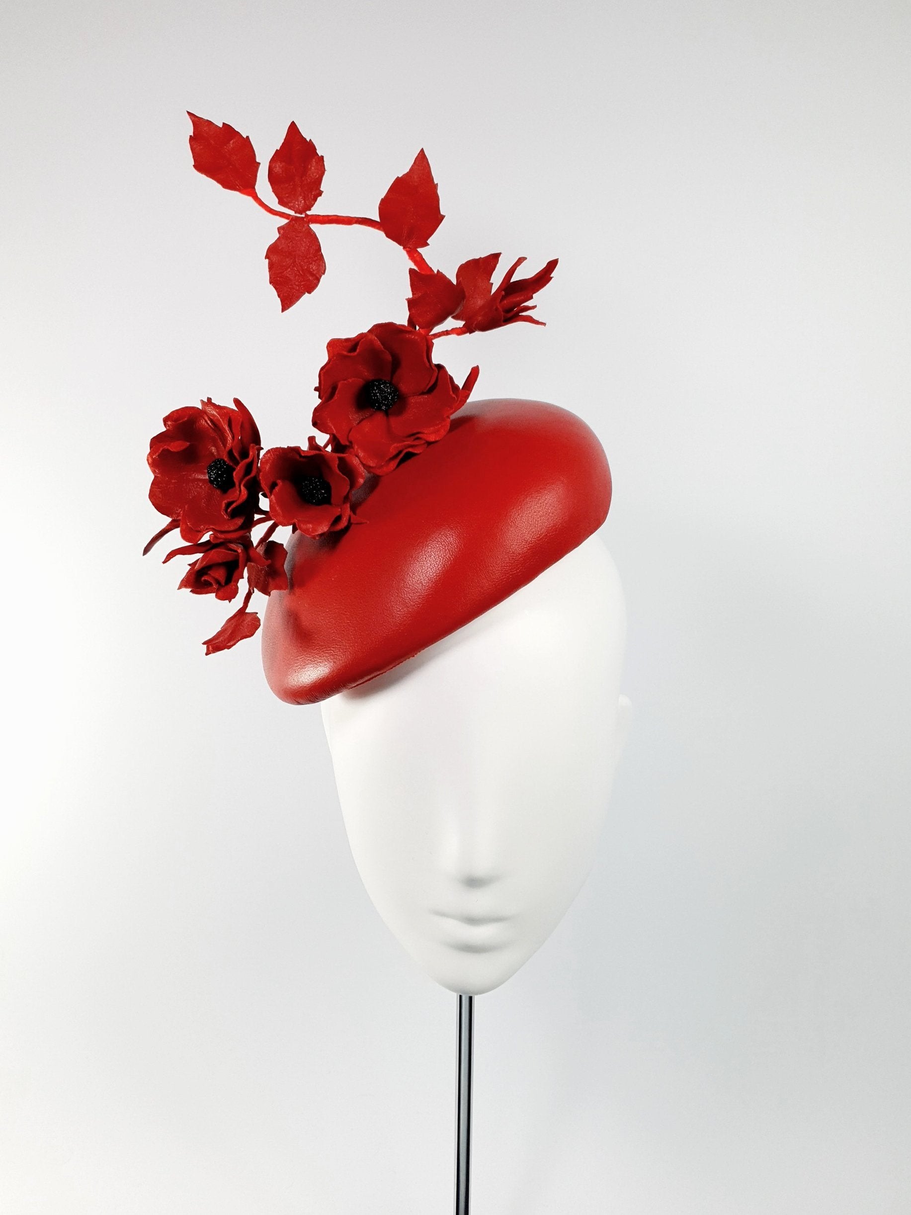 Elevate your outfit with this stunning leather beret headpiece. It features a striking arrangement of red Ballerina Roses and leaves positioned along a wired vein that adorns a matching leather beret-style base. This headpiece adds exceptional grace to any outfit.