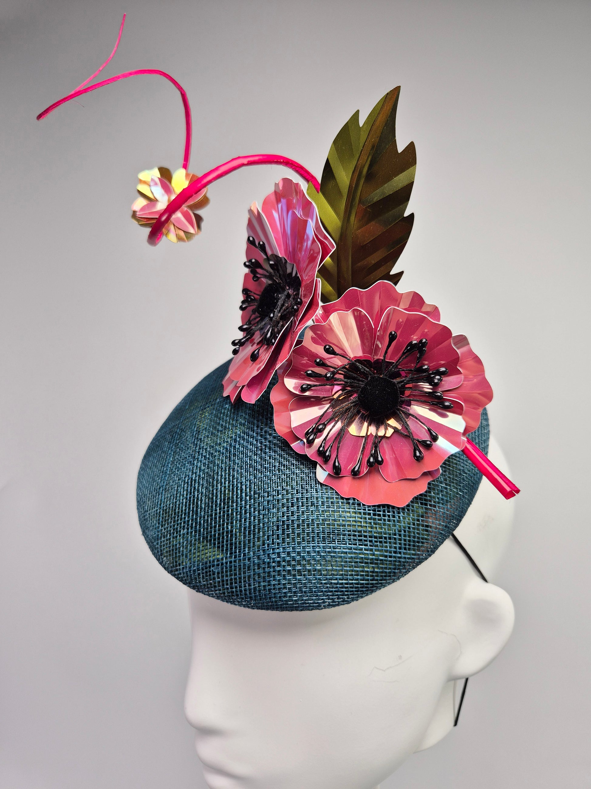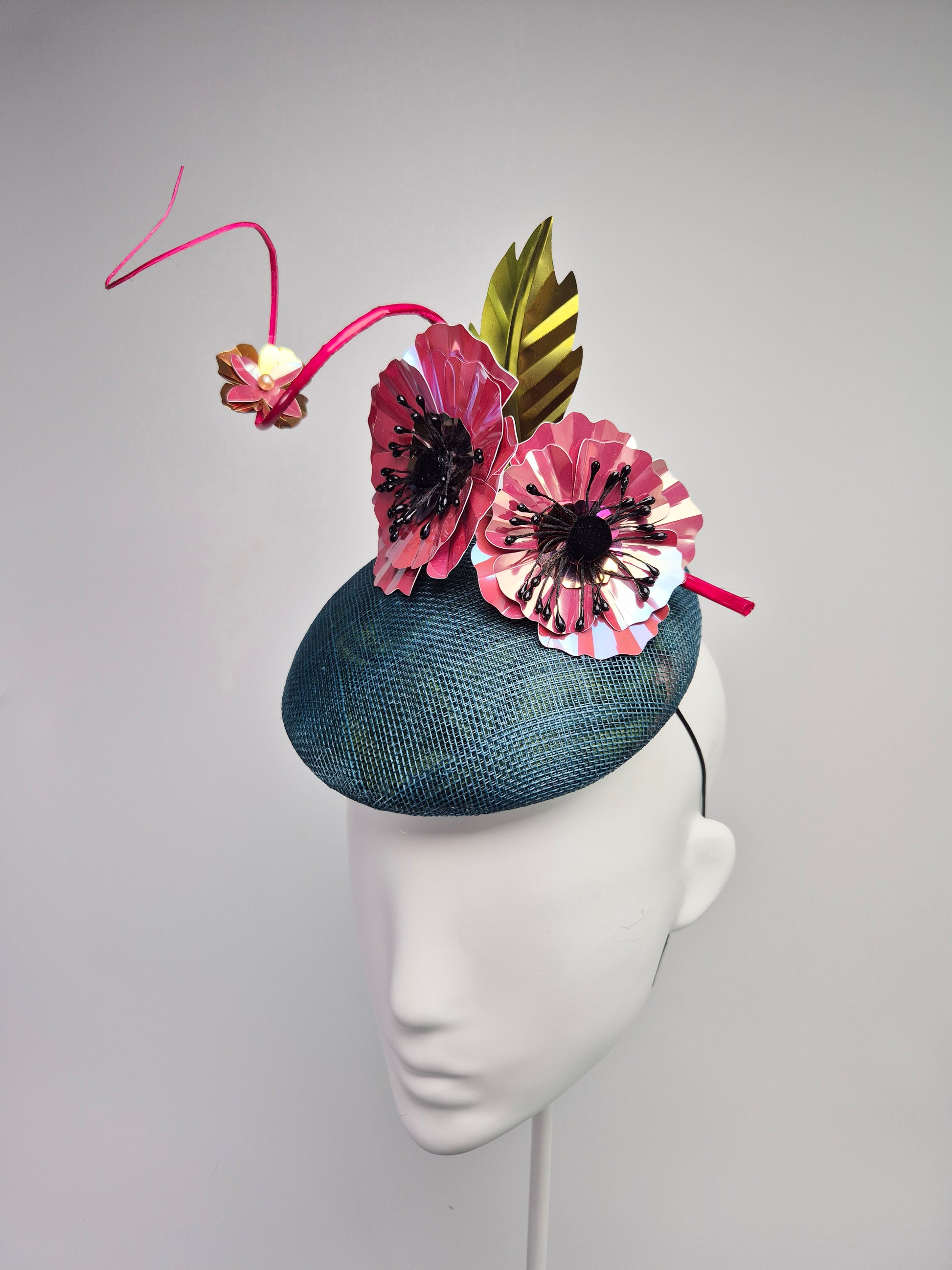 This stunning straw button percher hat boasts two beautifully crafted metallic poppies, leaves, and a curled quill that are wired by hand. The foil reflects light, making it an absolute show-stopper.