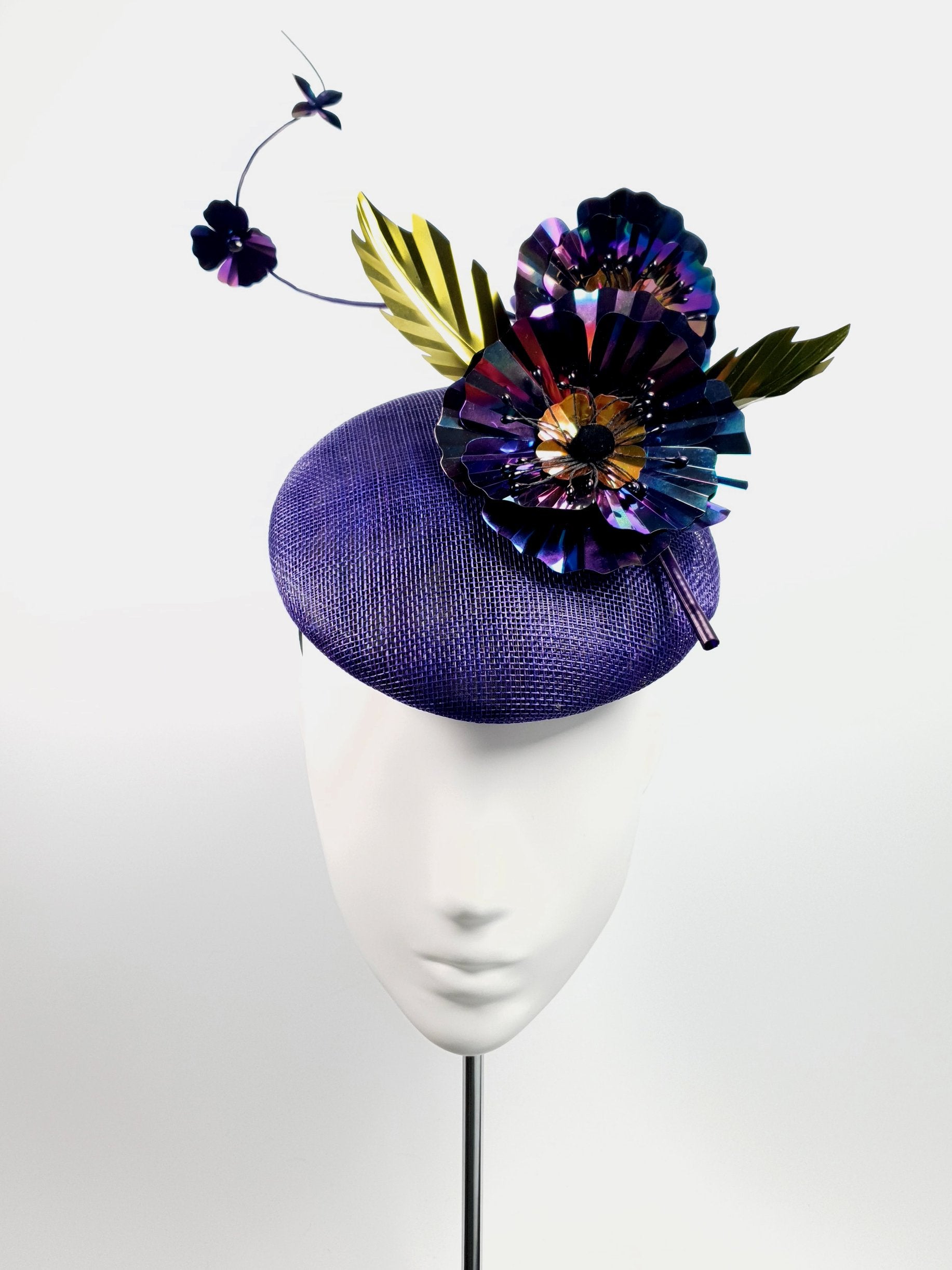 This stunning straw button percher hat boasts two beautifully crafted metallic poppies, leaves, and a curled quill that are wired by hand. The foil reflects light, making it an absolute show-stopper.