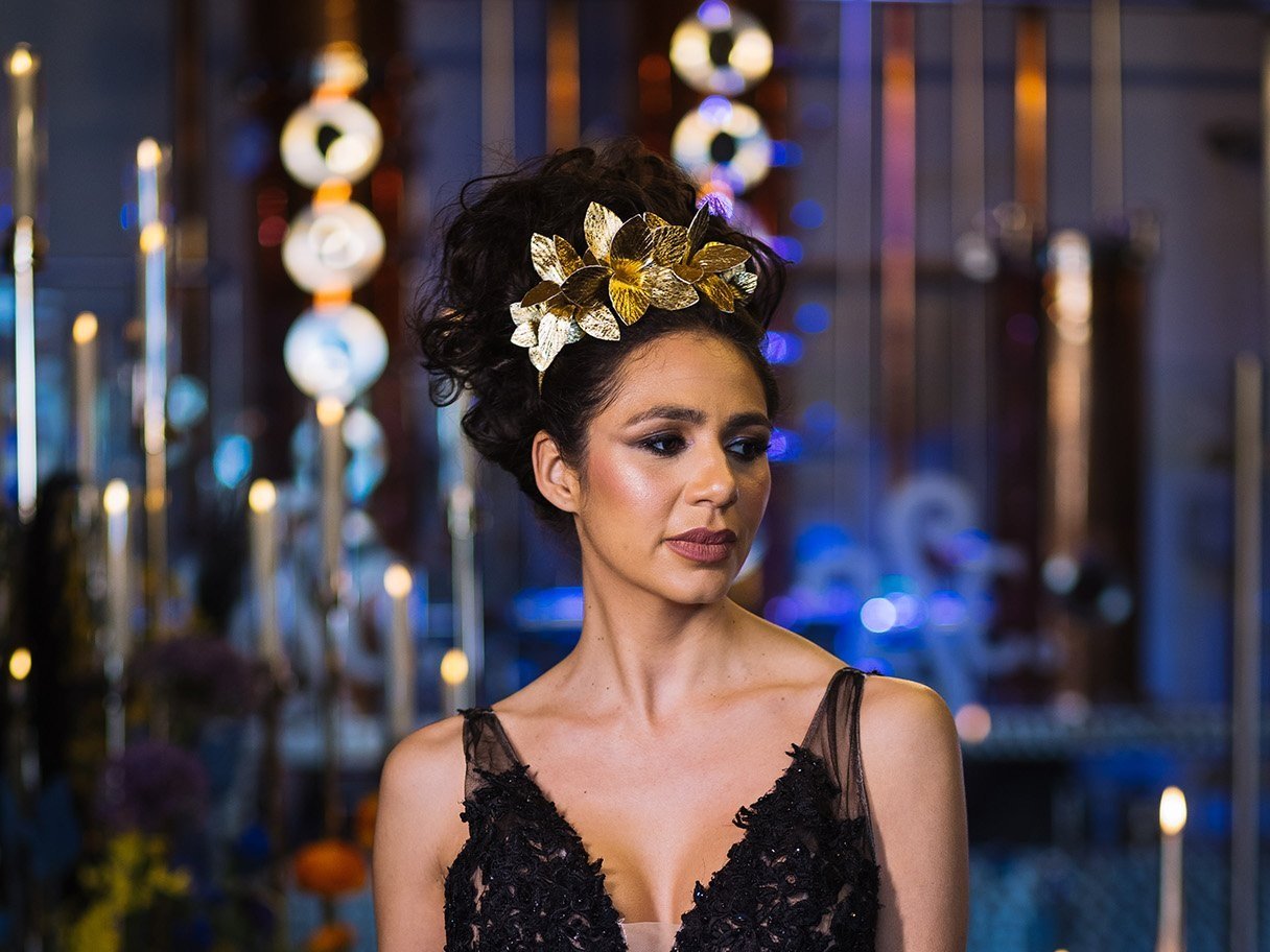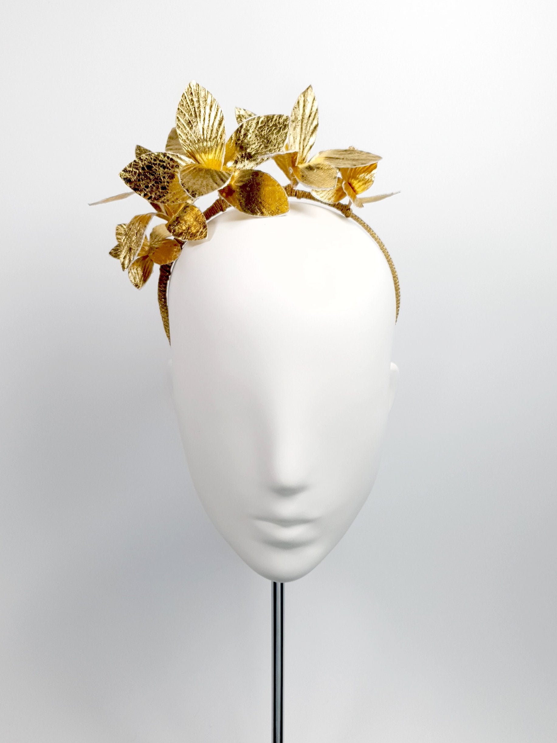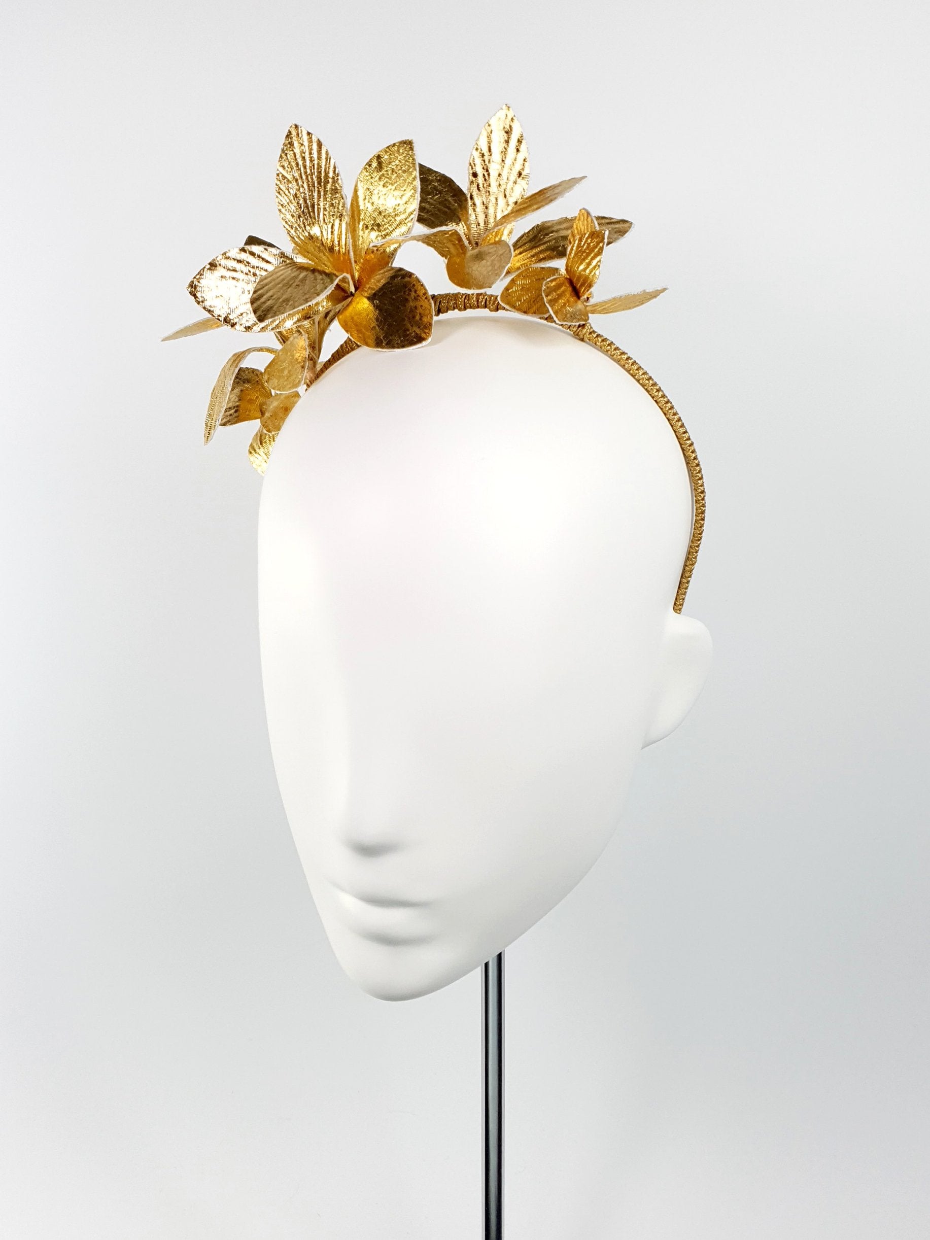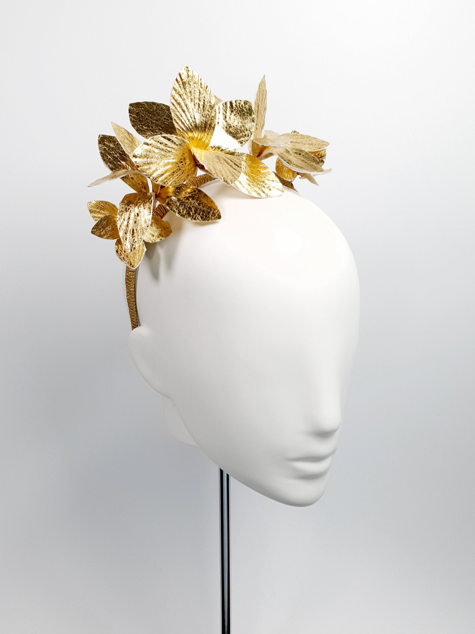 A WOW piece. This gold orchid crown is truly impressive. It features gold leatherette orchid leaves that add a touch of elegance to its lightweight design. The reflective quality of the gold fabric adds interest and a hint of glamour.