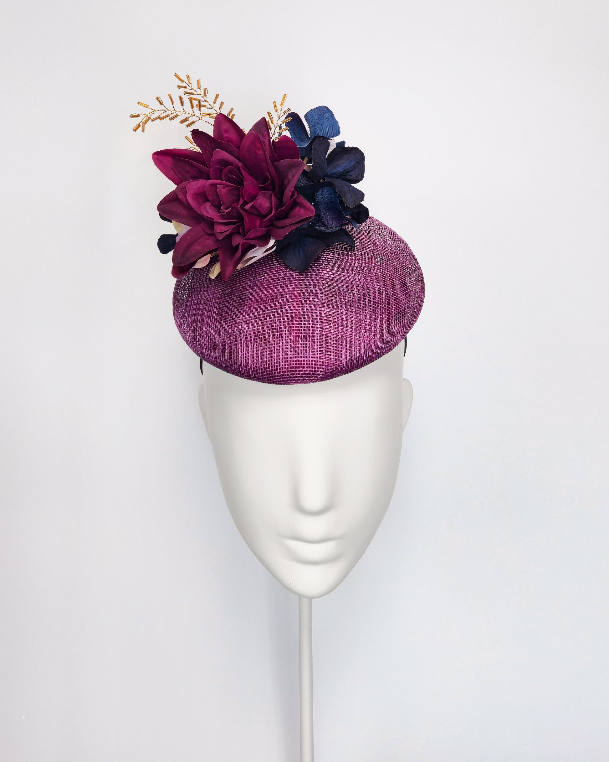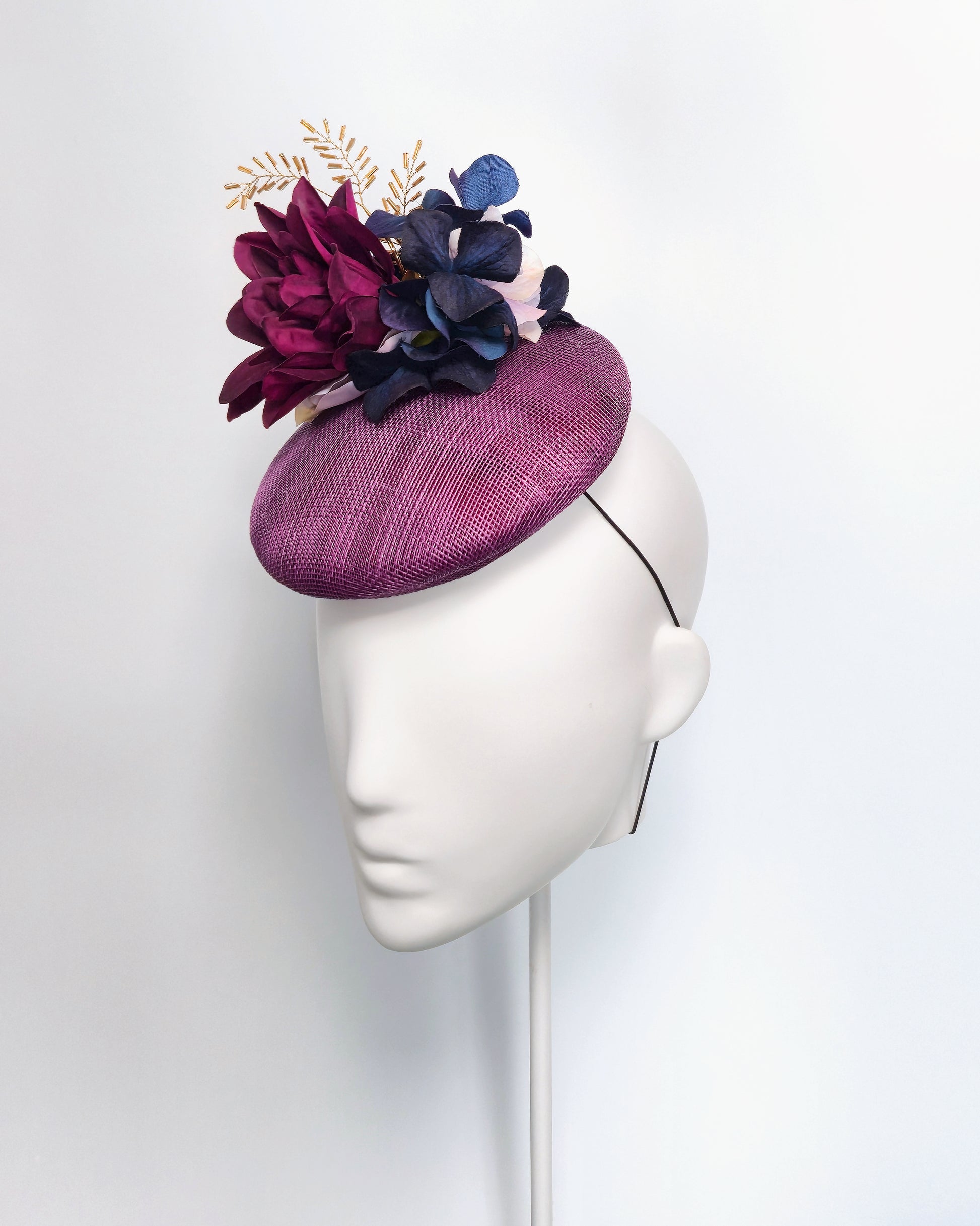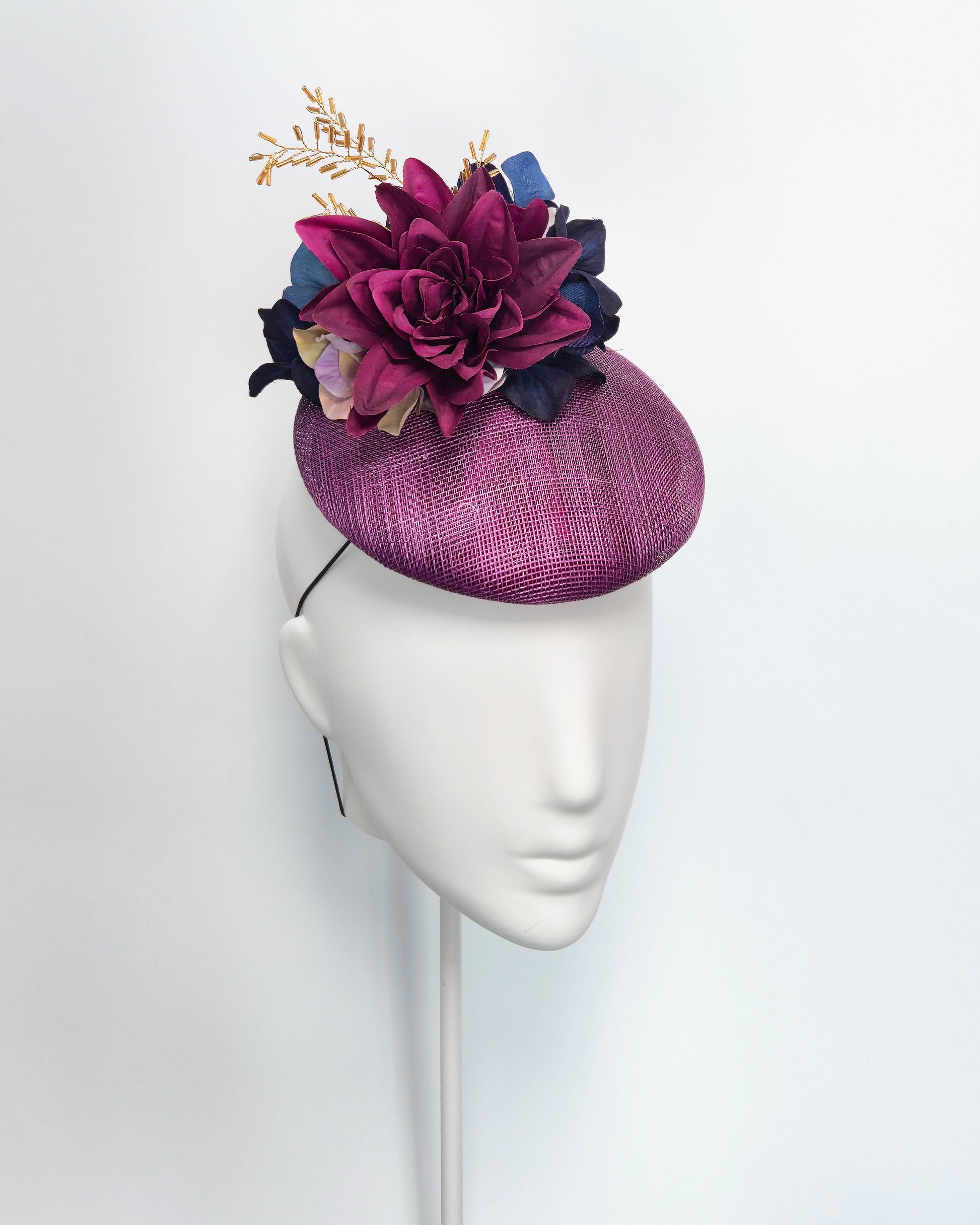 A sculptural percher headpiece formed on a rich plum base and finished with layered florals in deep berry and inky navy tones. Accented with fine gold detailing, Mara is designed to sit with a gentle tilt, balancing softness with confident structure.