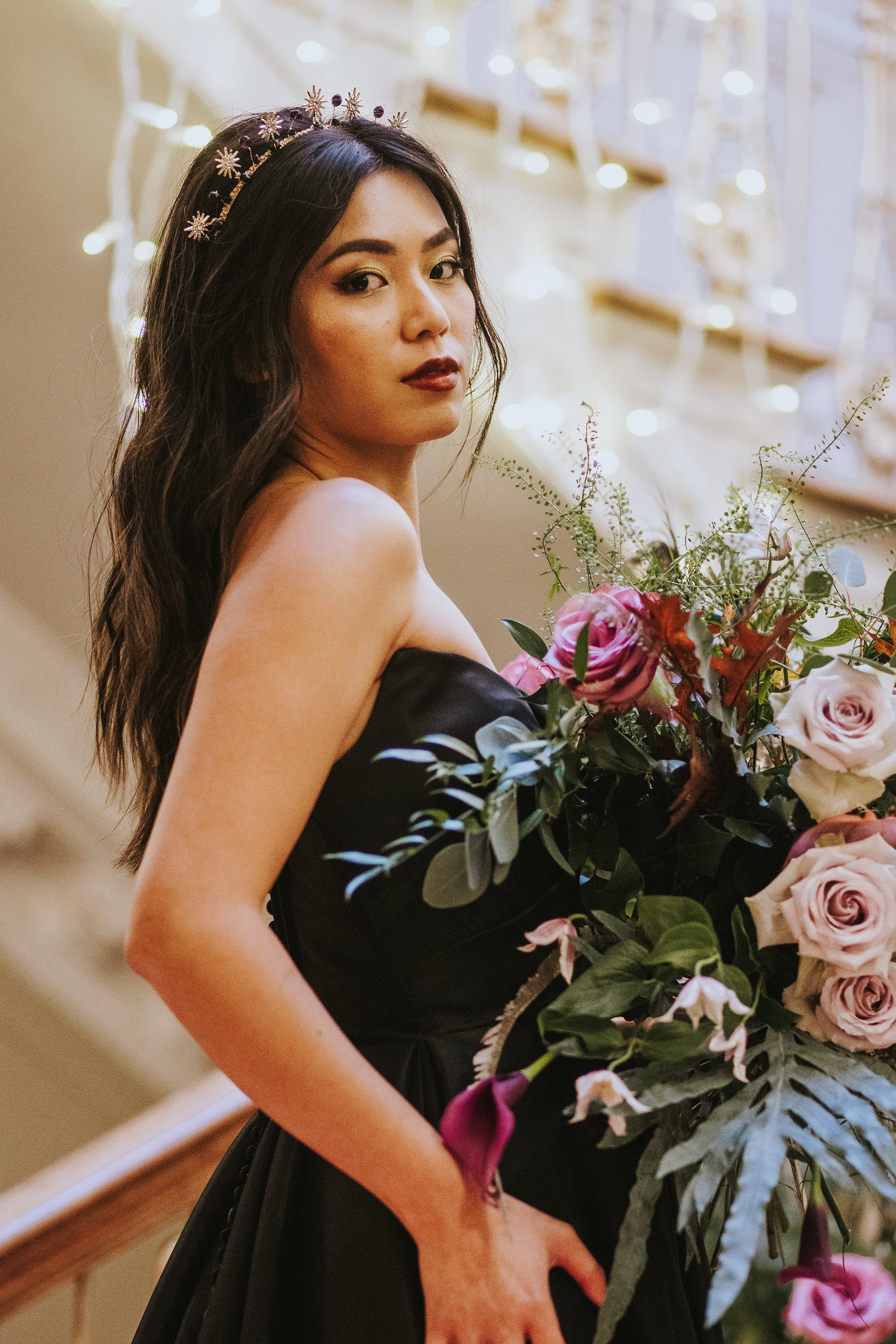 A refined black-and-gold bridal headpiece combining crystal starbursts with dark bead detailing for contrast and depth. Designed to catch the light subtly, with a comfortable, secure fit and a modern, celestial edge.