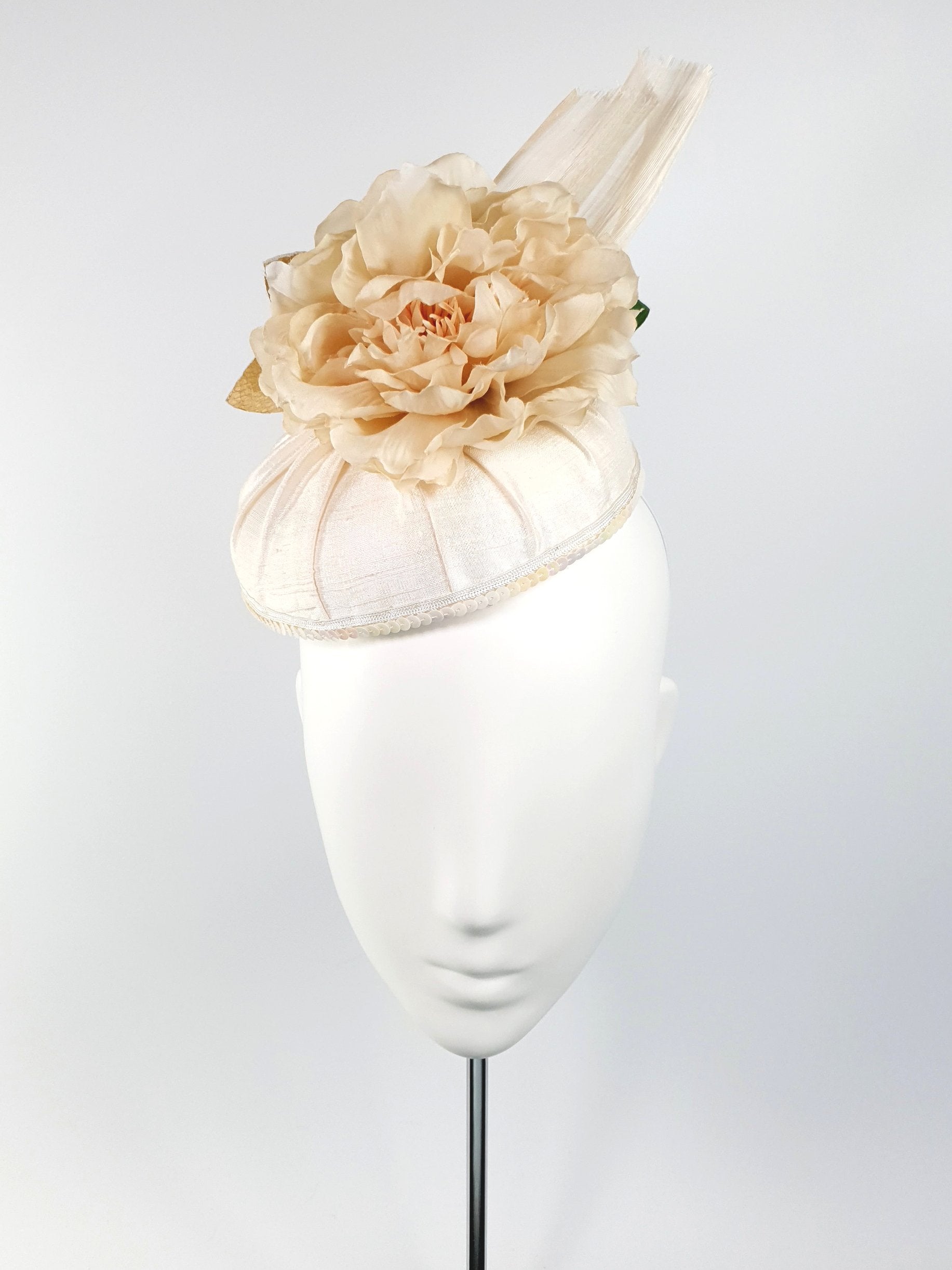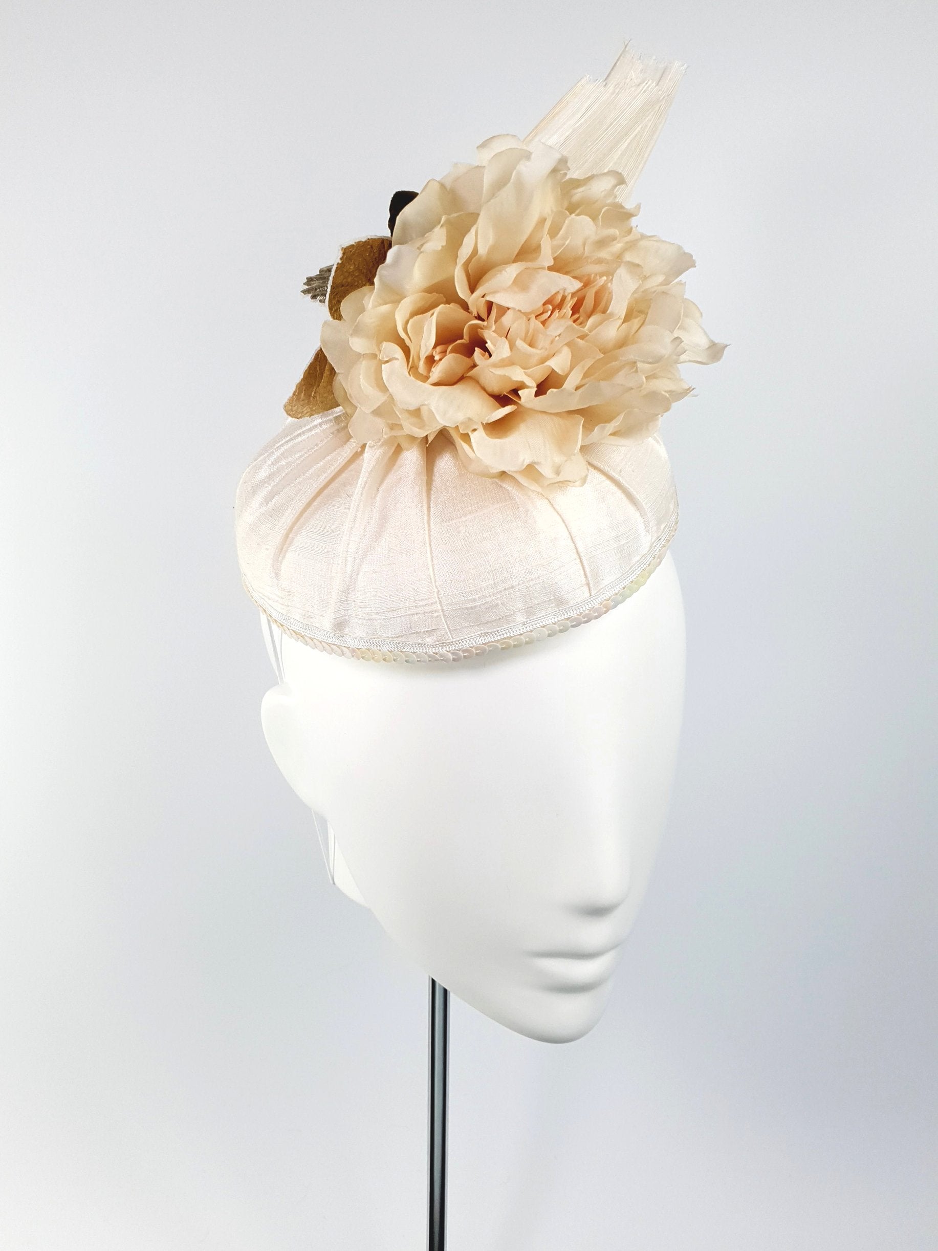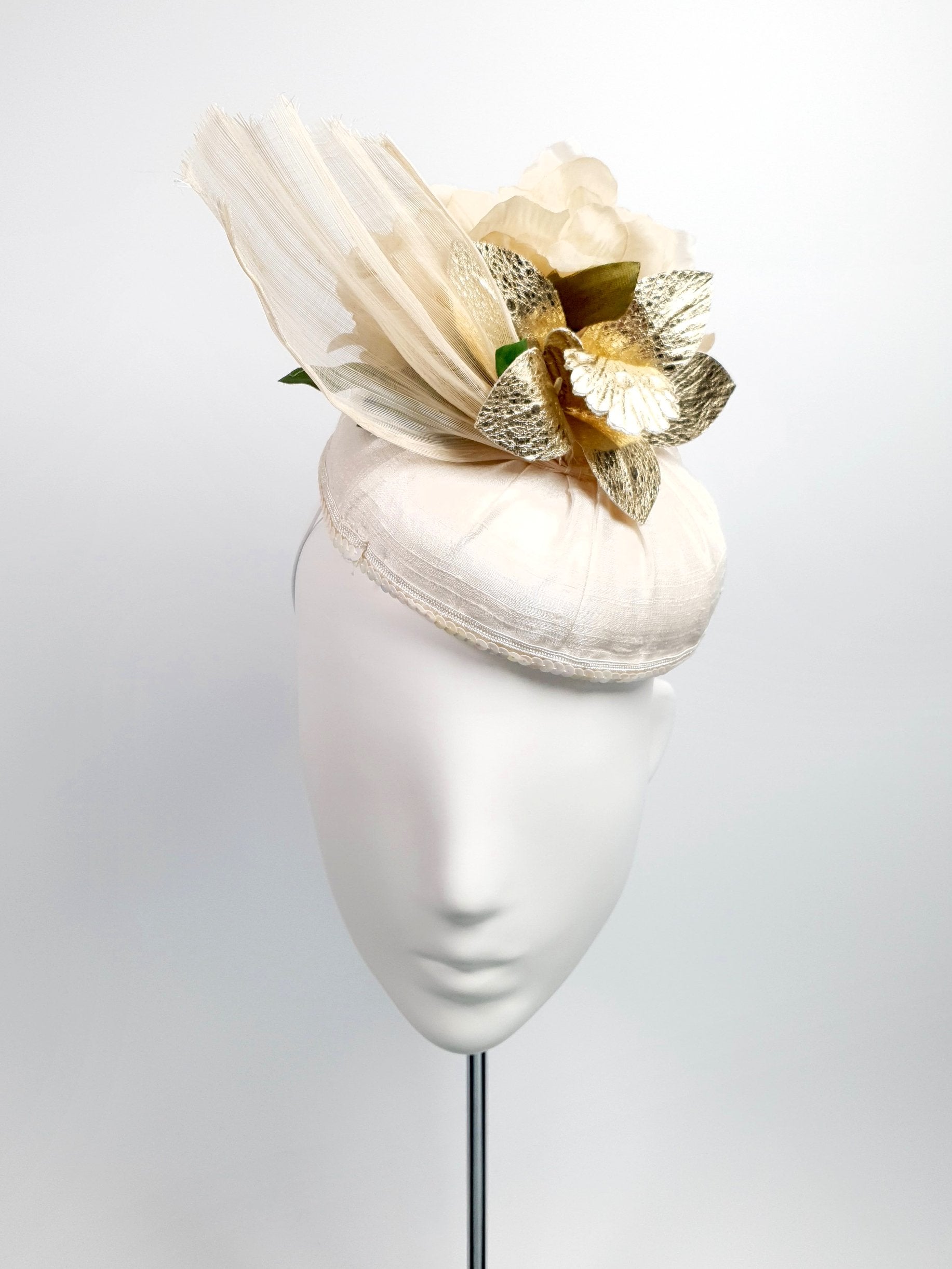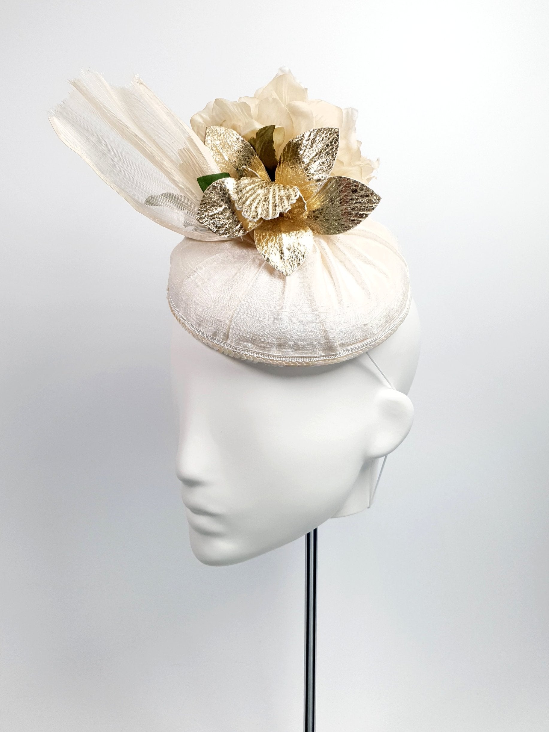 Peony & Orchid - Reversible lushness! This hat is versatile and can be worn in two different ways. During the day event, you can wear the silk peony to the front to create an elegant look. And at night, you can turn it around for a touch of gold orchid glamour.