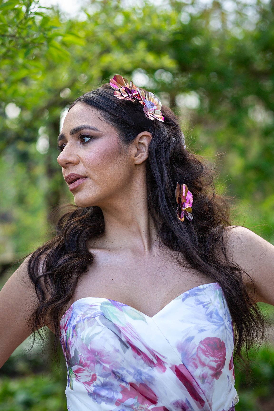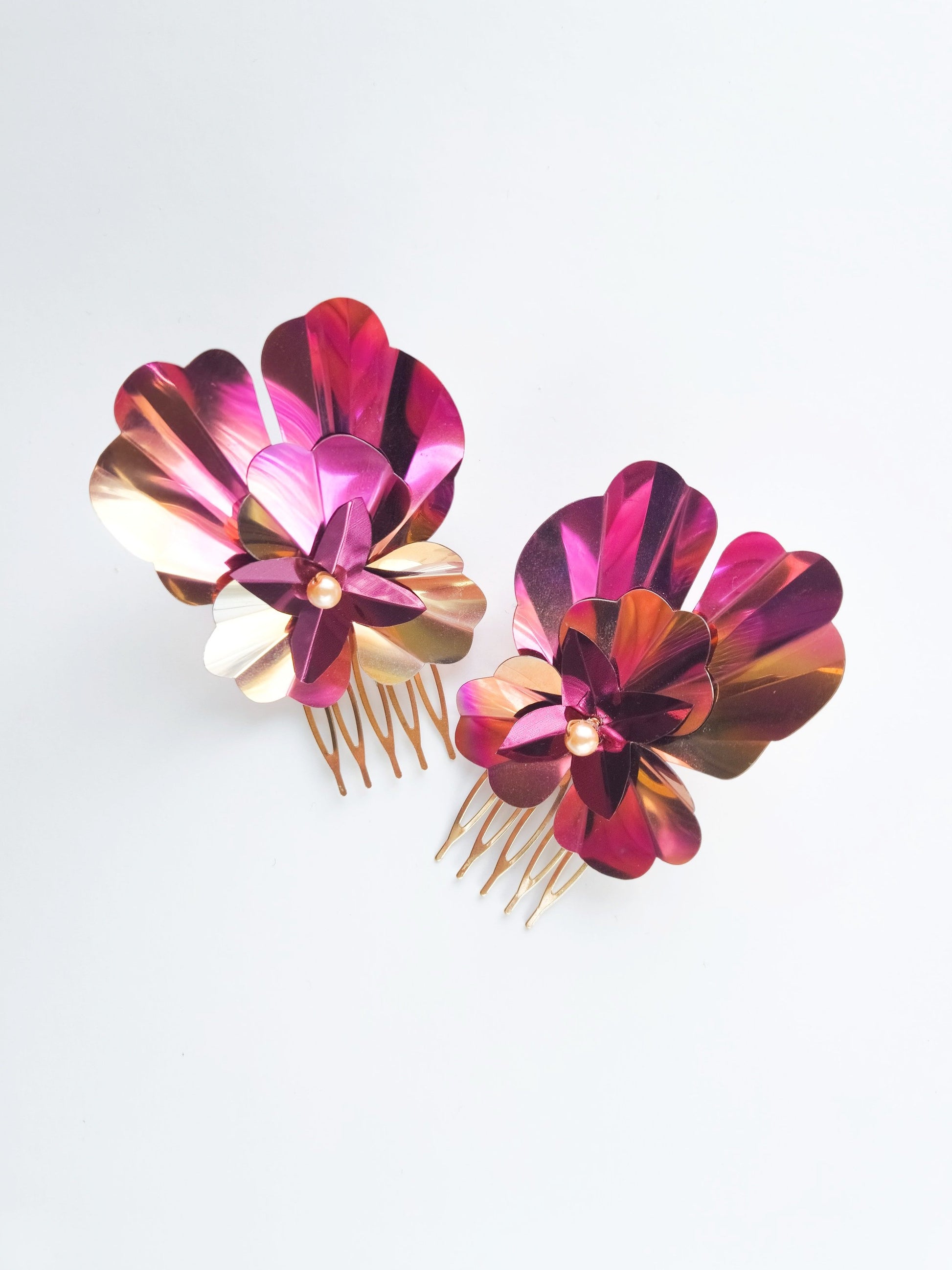 A set of two Pansy combs that adds a pop of colour to any outfit. Handmade from an oil slick film, the bright and shiny surfaces reflect the light in the most mesmerising way.