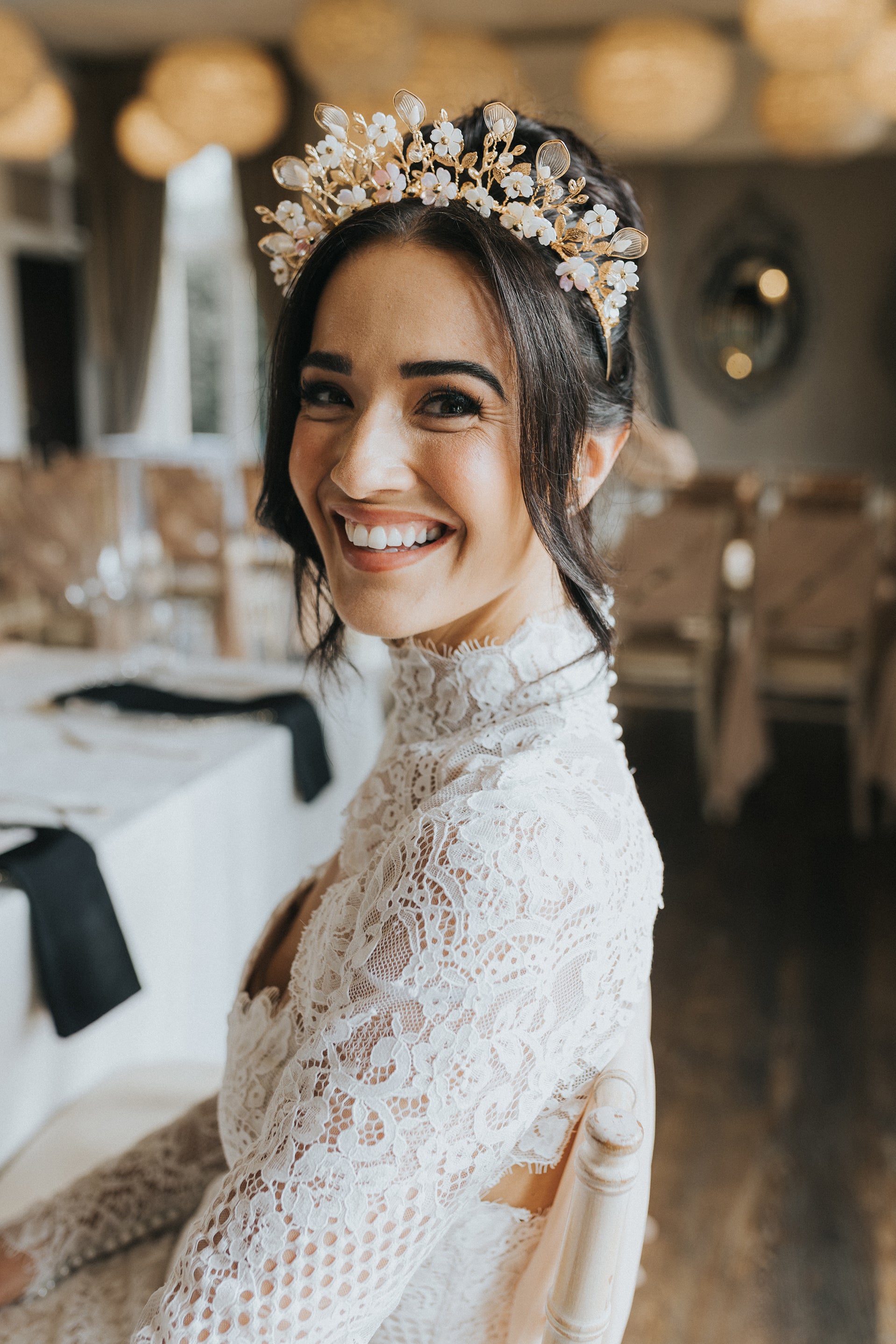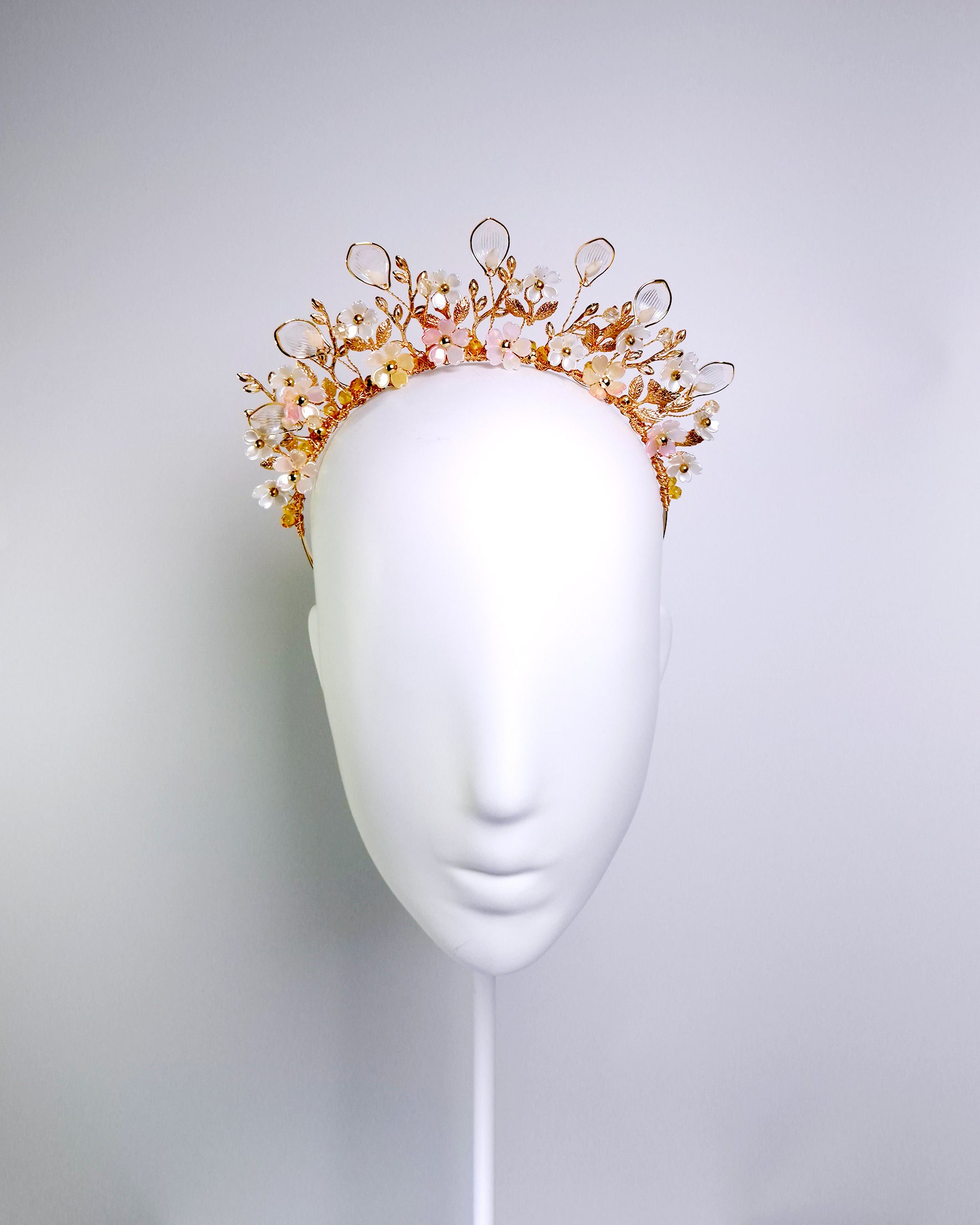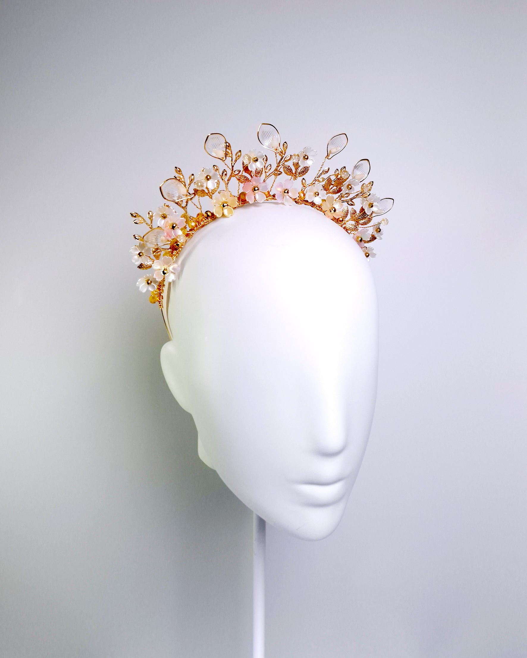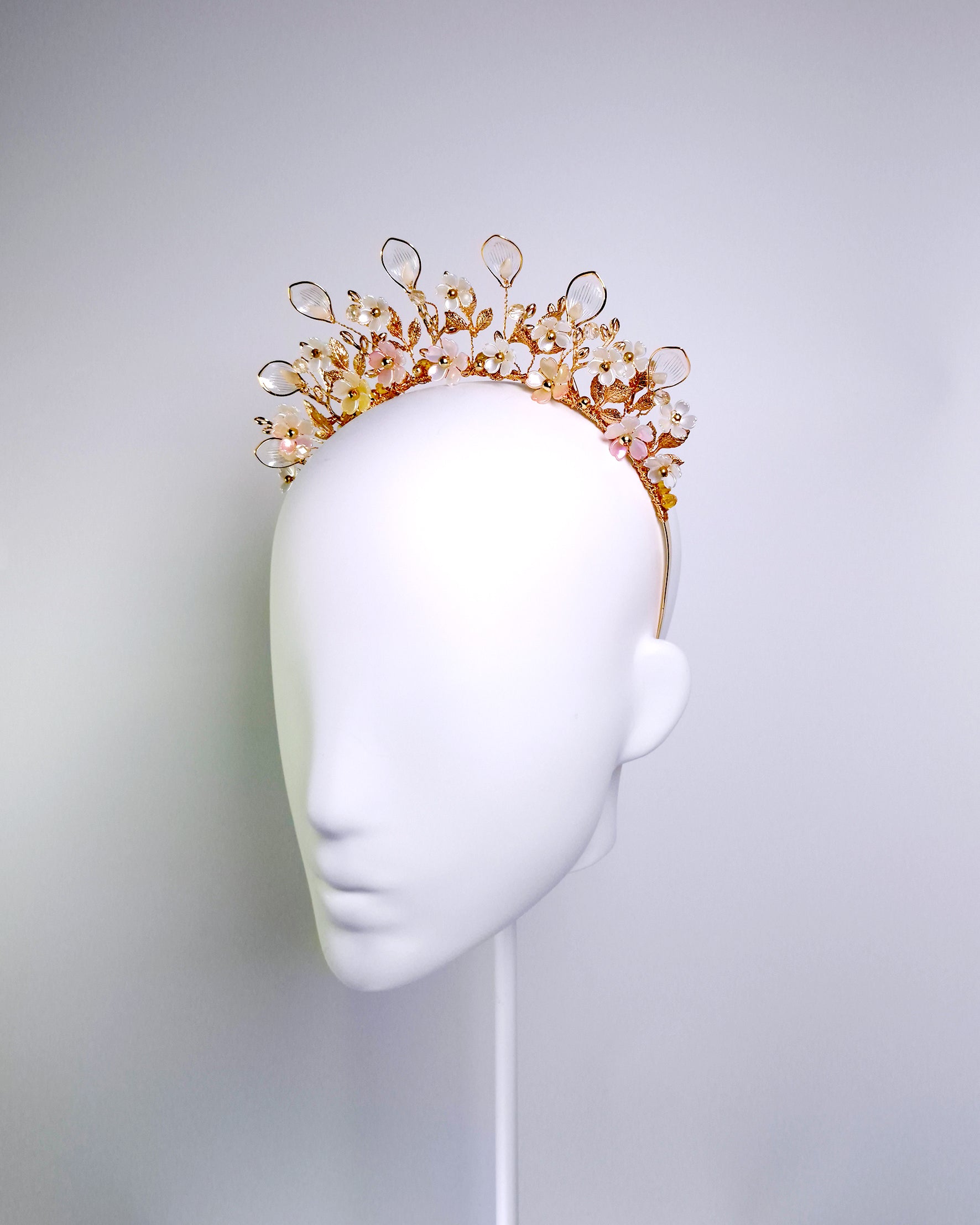 This dreamy floral headpiece is inspired by peach blossoms. Featuring soft pink and deep golden hues, it includes translucent clear petals, elegant gold branches and leaves, and golden Preciosa bicones that catch the light and are delicately arranged on a gold headband, creating an ethereal and feminine finish.